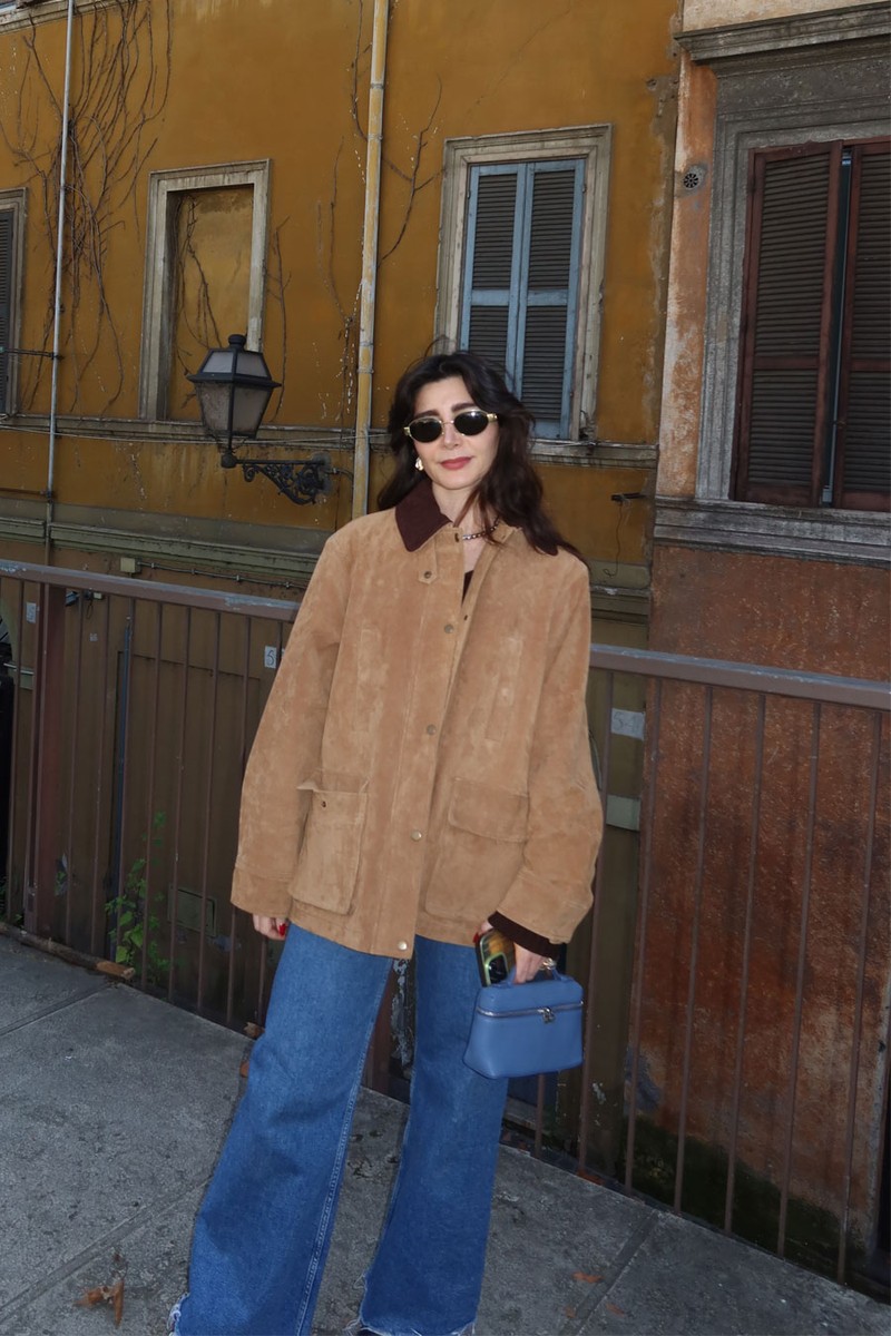 The Bottega Veneta Andiamo Long Clutch in Intrecciato suede. I style it in so many ways – either with a brown dress, nice tights and boots with a cool jacket on top, or with a pair of jeans, an oversized suede jacket and rain boots. I love pieces that do the work for you, so the rest of the outfit can stay minimal.