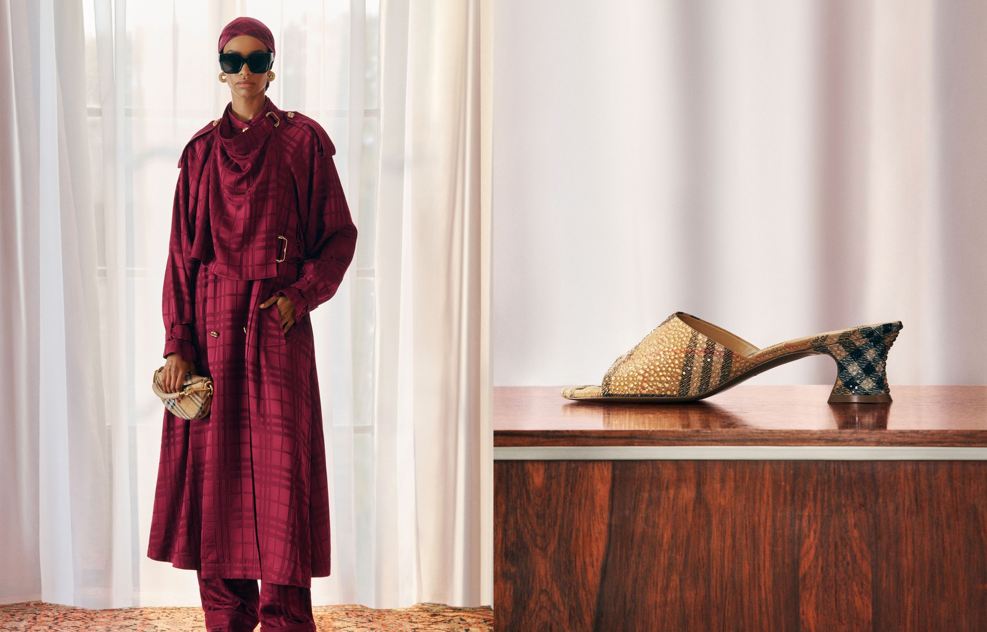 Burberry’s iconic check gets a refined, sparkling update for Ramadan. The capsule elevates the House’s signature codes with ultra-glam pieces, from rhinestone-embellished Sloane mules to a fully bedazzled Bridle clutch revealing the classic beige check beneath. Shimmering silk scarves, crystal-accented accessories, fluid dresses, jacquard silk pyjama sets and trench-inspired outerwear complete the lineup, all finished with gold-plated hardware.