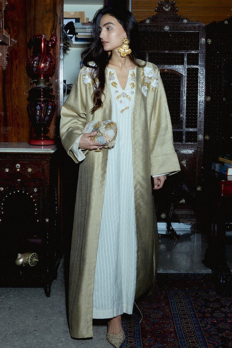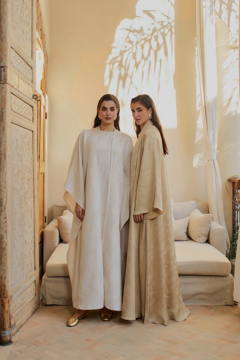 Tiya by Sania Maskatiya’s Ramadan Edit ’26 brings timeless elegance into the present with a refined selection of kaftans and abayas in a soft palette of navy, mint, peach, ivory and chestnut. Crafted from luxurious fabrics like khaddi corduroy and raw silk, the pieces feature flowing silhouettes and structured shapes that feel both effortless and elevated. Delicate embroidery, botanical motifs and eyelet detailing add subtle texture and artisanal charm, while tonal embellishments keep the look modern and polished.