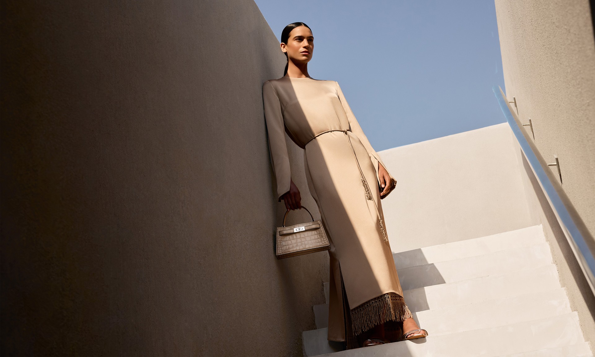 Gucci’s latest Ramadan collection champions quiet confidence: discreet yet bold, and effortlessly wearable. Fluid ready-to-wear silhouettes are accented with metallic and feather-like embellishments for easy day-to-evening dressing. Highlights include a knitted gold long-sleeve top with matching wide-leg trousers, plus festive yet refined accessories such as rhinestone-studded eyewear and the iconic Princetown slipper in dusty rose with crystallised GG monogram. Altogether, the collection feels like a slick retro ode to the past – enlightened, elegant, and undeniably memorable.
