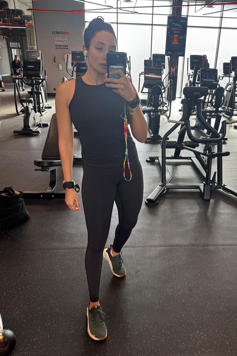 When it comes to gym wear, my go-to leggings are the Lululemon Align High Rise Ribbed Leggings, paired with the Oysho Comfortlux sports bra and Nike Free Metcons. On lower-body days, I’ll layer an oversized Oysho T-shirt, and on upper-body or cardio days, I switch to the Lululemon Align Waist-Length Racerback Nulu Tank. It’s a simple rotation, but one that always works, and the one thing I can’t train without is a good pair of workout gloves – non-negotiable. A Saudi active wear brand I love is Kayanee and my favourite wellness destination right now is Oia Downtown. It has genuinely elevated the local wellness experience for me.